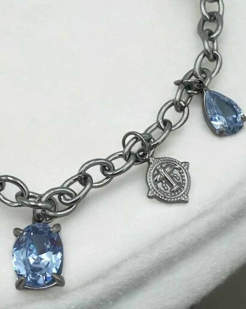 Βραχιόλι από ανοξείδωτο ατσάλι με κρεμαστά στοιχεία και γαλάζιες πέτρες κρυστάλλου